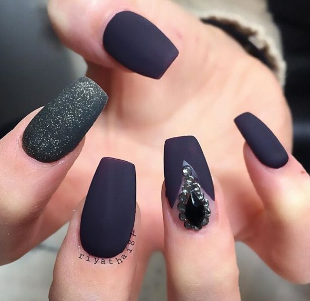 Чёрный матовый маникюр со стразами