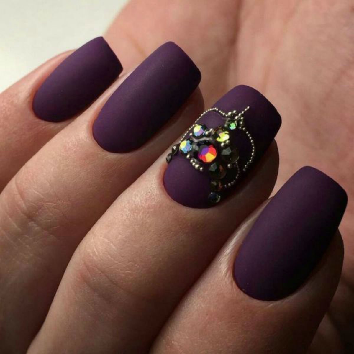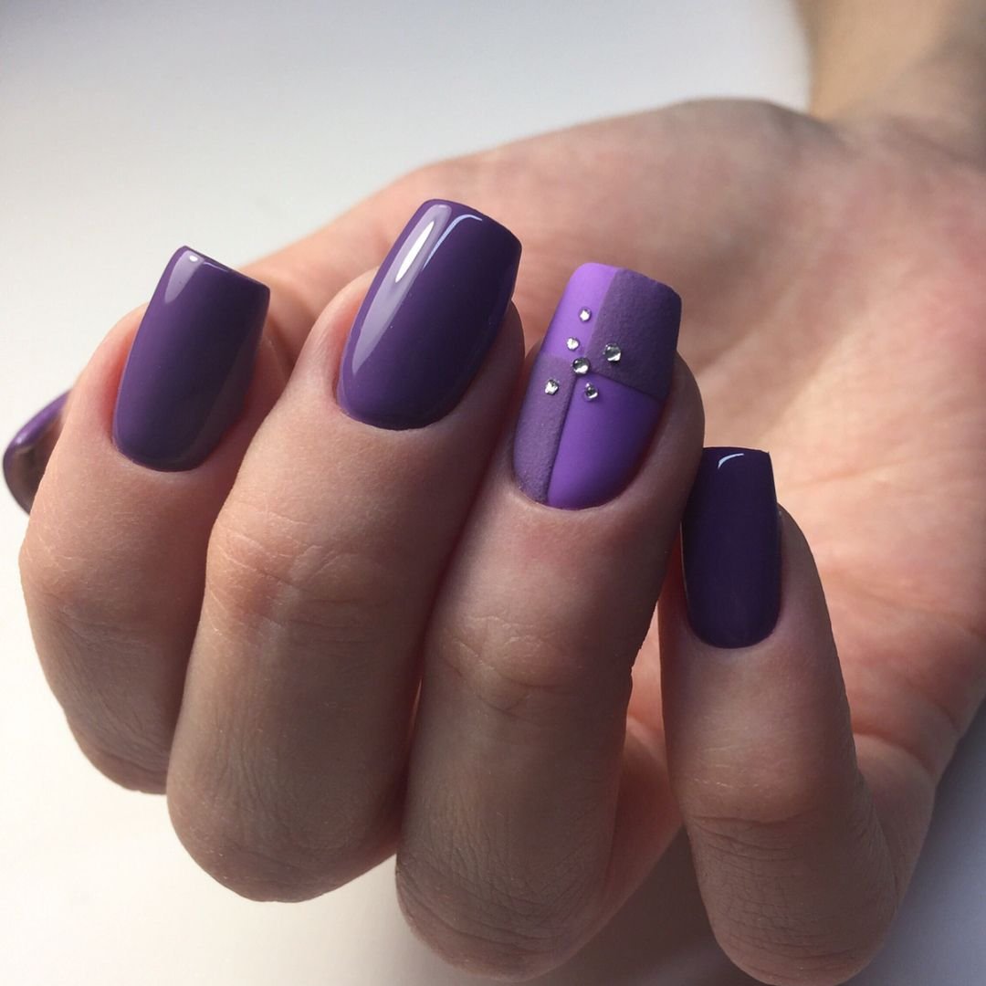 Фиолетовый матовый маникюр со стразами